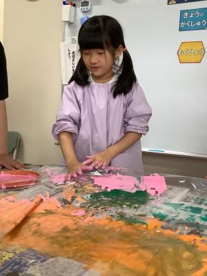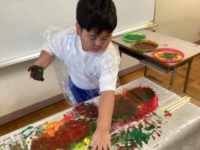 図工の授業で、洗濯のりを混ぜた絵の具を使って、手や指で模様を描きました。
