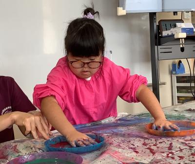 液体粘土に色を付けて、ふわふわの絵の具を作りました。ふわふわの感触を楽しみながら、指先や手を使って絵を描きました。