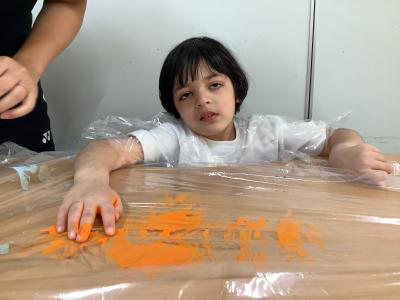 最初はそっと触っていた子ども達も、回数を重ねるごとに手にいっぱい絵の具を付け、たくさん動かして模様を描くことができました。