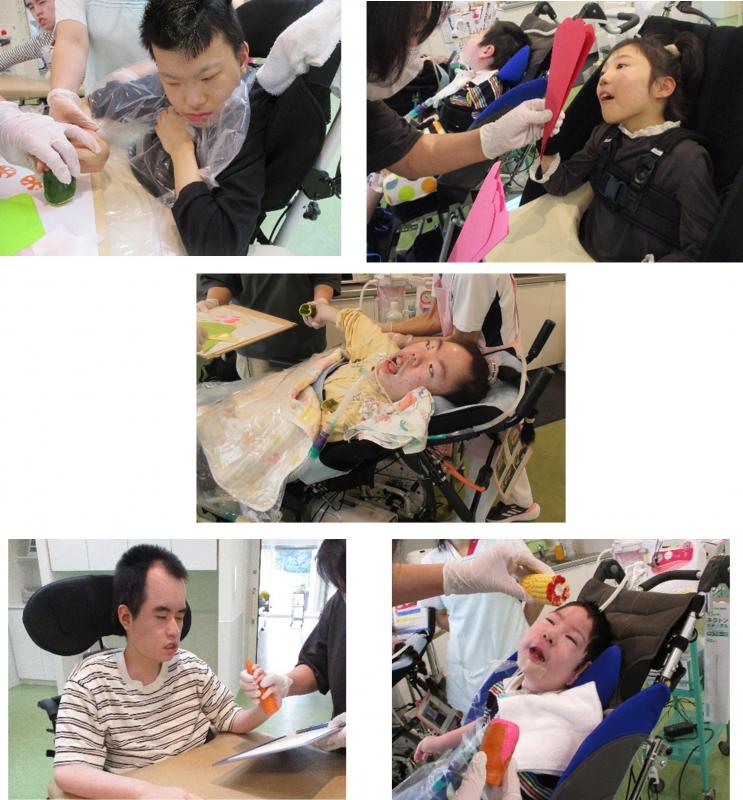 輪切りにした野菜をスタンプにして、花束を描きました。野菜の模様が、綺麗な模様となりました。